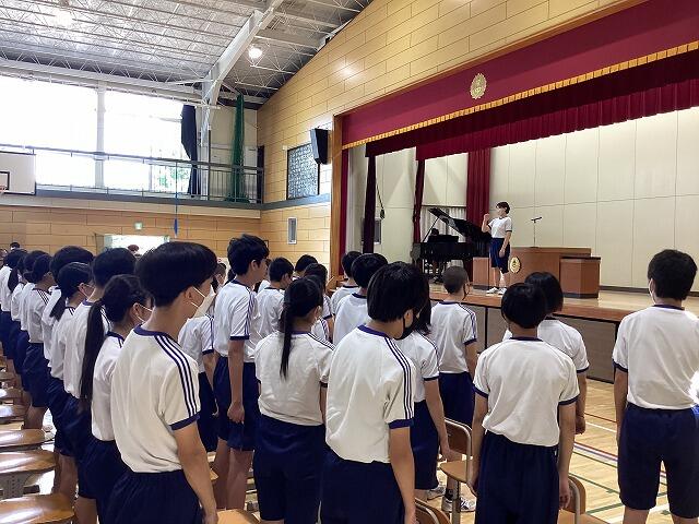 終業式では校長先生のお話、生徒代表のお話を聞き、校歌を歌いました。