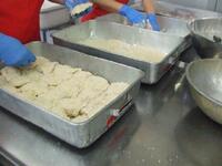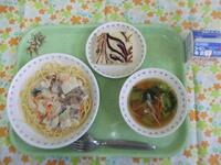今日の給食「クリームソーススパゲティ」は、鶏肉、たまねぎ、にんじん、ほうれん草、マッシュルームをクリームソースで煮込み、スパゲティにかけていただきます。まろやかなクリームソースとスパゲティがよく合います。