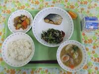 牛乳・ご飯・鯖のガーリック焼き・青大豆とひじきのサラダ・野菜の胡麻煮・味噌すいとん汁・清見オレンジ