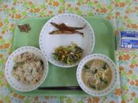 牛乳・中華おこわ・ししゃもの香味ソースかけ・ごぼうと枝豆のサラダ・ワンタンスープ・メープルアーモンド