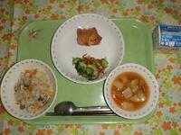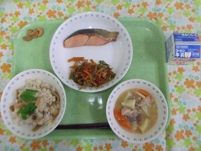 牛乳・たけのこ御飯・鮭のバター醤油焼き・五目きんぴら・呉汁・メープルカシューナッツ
