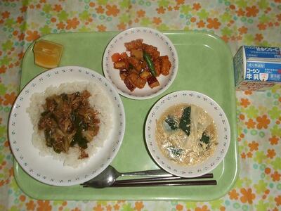 牛乳・ホイコーロー丼・いかとさつま芋の揚げ煮・ワンタンと卵のスープ・甘夏みかん