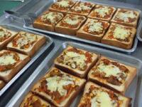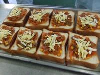 今日の給食「ピザトースト」は、たまねぎ、にんじん、ピーマン、マッシュルームをトマトケチャップを加えて煮込んだピザソースを食パンに塗り、チーズをのせてオーブンで焼きました。