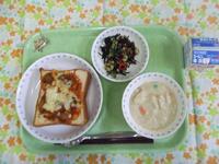 牛乳・ピザトースト・青大豆とひじきのサラダ・鶏肉のクリーム煮・アーモンド小魚