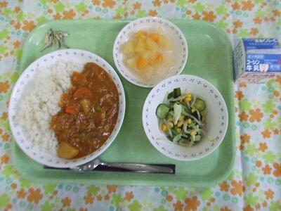 牛乳・ハヤシライス・わかめとコーンのサラダ・ナタデココ入りフルーツポンチ・アーモンド小魚