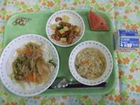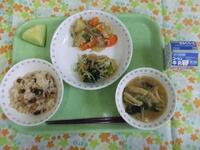 牛乳・いわし御飯・じゃが芋のそぼろ煮・アーモンド和え・大根の味噌汁・メロン