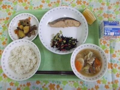 牛乳・ご飯・鮭のガーリック焼き・青大豆とひじきのサラダ・野菜の胡麻煮・味噌すいとん汁・美生柑