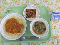 牛乳・スパゲティミートソース・千切り野菜のスープ・マーブルケーキ・アーモンド小魚
