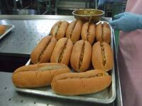 今日の給食「チリドック」は、豚肉、たまねぎ、高野豆腐のみじん切りをケチャップ、カレー粉、チリパウダーを加えて煮込み、コッペパンにはさみました。スパイスの風味がパンとよく合います。