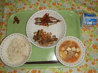 牛乳・ご飯・ししゃもの南蛮漬け・五目豆・どさんこ汁・メープルアーモンド