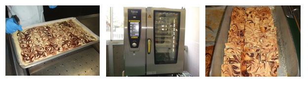 天板に生地を流して、マーブル模様にします。 オーブン180℃で15分焼いて出来上がり。