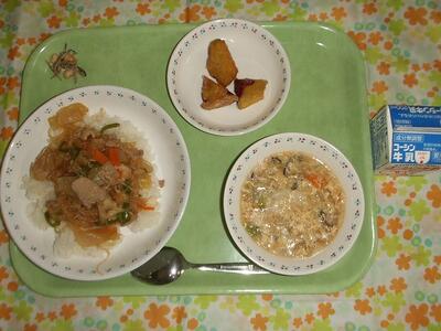 牛乳・プルコギのっけご飯・トックと卵のスープ・シュガーポテト
