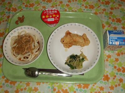 牛乳・冷やしぶっかけうどん・かしわ天・ほうれん草のお浸し・ヨーグルト・炒りカシューナッツ