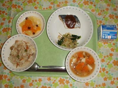 牛乳・鶏ごぼう御飯・鰆のごまだれかけ・辛子和え・さつま汁・フルーツみつ豆