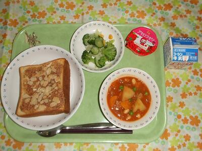 牛乳・アーモンドトースト・ポークビーンズ・ブロッコリーサラダ・アセロラゼリー・アーモンド小魚