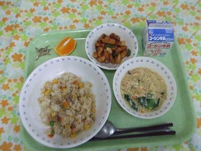 牛乳・五目炒飯・いかとカシューナッツの揚げ煮・春雨と卵のスープ・デコポン・だいず小魚