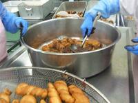 今日の給食「チキンカレーライス」は、鶏肉、たまねぎ、にんじん、じゃがいもを炒め、給食室手作りのルウで煮込みました。