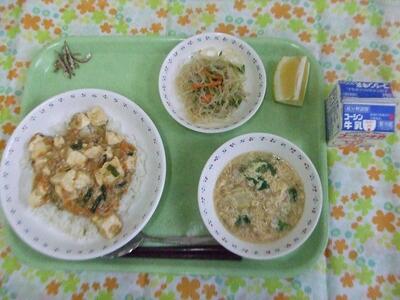 牛乳・麻婆豆腐丼・バンサンスウ・卵とワンタンのスープ・美生柑・小魚