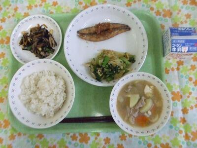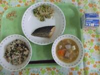 牛乳・ひじき御飯・鰆のピリ辛照り焼き・ごま酢和え・味噌けんちん汁・きな粉大豆