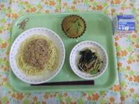 今日の給食「肉味噌そば」は、豚肉、たまねぎ、椎茸、ピーマンを加えた肉味噌を中華麺にかけていただきます。味噌とオイスターソース、豆板醤で味付けした肉味噌は中華麺とよく合います。