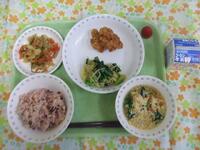 牛乳・赤飯・鶏肉の唐揚げ・アーモンド和え・五目きんぴら・かきたま汁・いちご