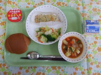 牛乳・ロールパン・鮭のパン粉焼き・ブロッコリーサラダ・ミネストローネ・ヨーグルト