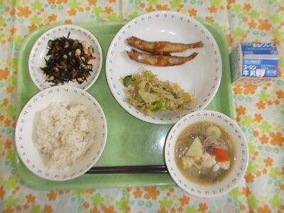 牛乳・ご飯・ししゃもの香味ソースがけ・胡麻酢和え・大豆の磯煮・豚汁