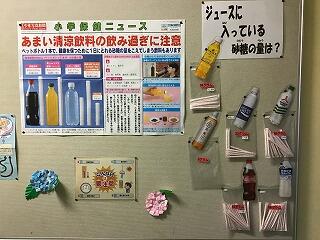 7月になり熱中症に気をつけながら生活することが必要になります。水分補給が大切!と言いますが,水分の種類を考えないと大変なことに…!という注意喚起の掲示物が目を引きました。ジュースにはこんなにもたくさんの砂糖が入っているのですね。実際の砂糖の量が掲示され,先生方も驚きました。みなさんも,水分補給の際には飲むものを選んでいきましょうね。
