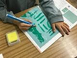 掘り進み版画に挑戦中です。彫刻刀を上手に扱って掘り進めながら,インクをのせて印刷し,版木を洗って乾かして彫り,次のインクをのせて印刷…と繰り返していきます。様々な色が重なり,素敵な作品になるように頑張り中です。