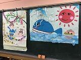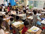 1年生の図画工作の学習です。絵の具を上手に扱って筆で色を作ったり塗ったりする楽しさを味わっています。どの作品も素敵な色合いと模様で,天才画伯がたくさん現れました。