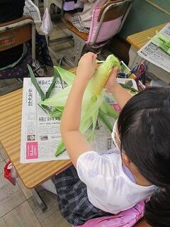 一覧へ 【3年生とうもろこしの皮むき】 日時 2022年07月06日(水) 公開対象 給食こんだて 詳細 【今日の献立】 ホイコーロー丼 うずら卵とごまのスープ とうもろこし アーモンド 牛乳 ◎3年生がトウモロコシの皮をむいてくれました。 一生懸命むいて、皮もひげも丁寧に取ってくれました。 給食では3年生がむいてくれたトウモロコシを蒸して、少しだけ塩をふって提供しました。 自分でむいたトウモロコシの味は格別だったようです。 おかわりにも、何人もの手が挙がっていました。 作成者 西原小学校管理者 更新日時 2022-07-11 08:21:31