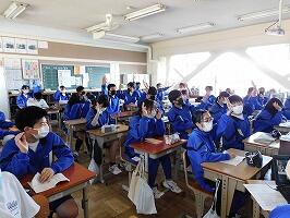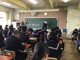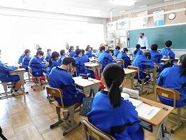 2月17日(金)3時間目に1年生は学年道徳を実施しました。西原小学校との教職員合同研修会として,教育実践研究家の菊池省三線sネイにご来校いただき,1年生全員に対し,授業を行ってくださいました。飛び込み授業ということでしたが,生徒ともすぐに慣れ,とても活発に生徒の発表が行われました。発表した生徒に対し,拍手と称賛を送り,とても和やかな雰囲気の中,授業が進み,1時間があっという間に過ぎていきました。