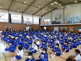 1年生はリモートで,2・3年生は体育館で行いました。
