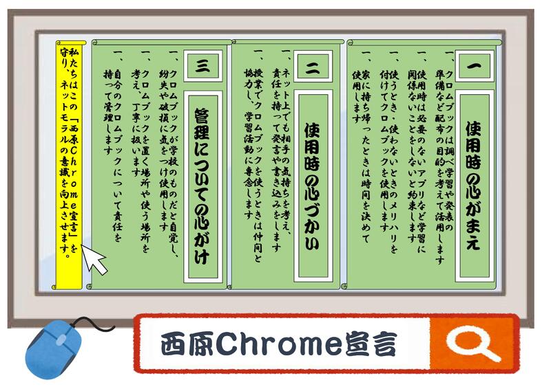 また,今年度は全校討議で「西原Chrome宣言」を採択ました。タブレットの使い方のマナーを生徒で話し合いをし,決定をしました。みんなで決めたこの宣言を意識し,タブレットを使用してほしいと思います。