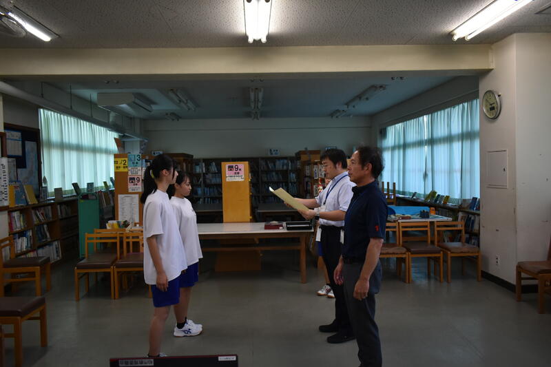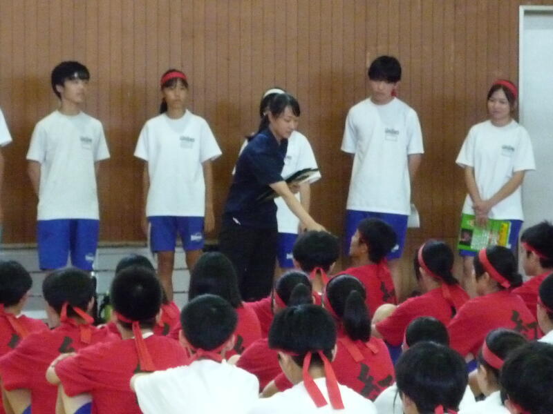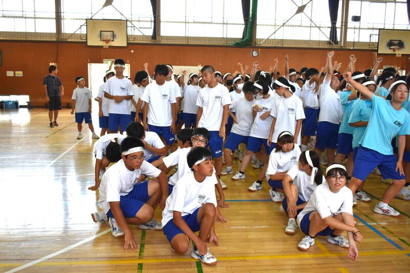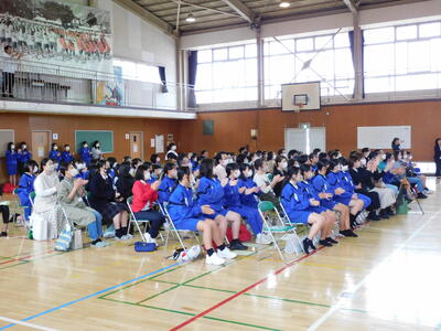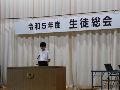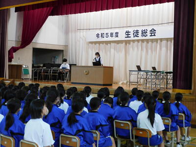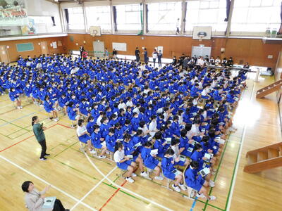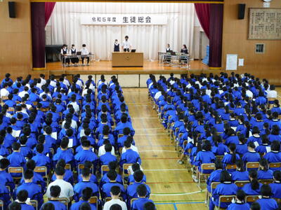 生徒会総務部が準備を進め,4年振りに全校生徒が体育館に集まって行うことができました。