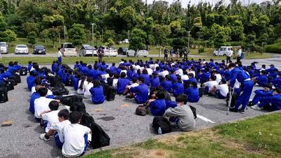 11時45分 報知音が鳴り、緊急放送が入りました。「ただいま、震度5強の地震の予報がありました。直ちに物が落ちてこない場所に避難してください。」皆さんがどんな行動が取れるのか・・・、予想ではざわついてしまったり、私語が出てしまうのではと思いましたが、皆さんは報知音が鳴ったとたんに、先生方から指示が出る前に、無言で素早く机の下や安全な場所に、第一次避難をしていました。各階では授業の入っていない先生方や学校運営協議会委員の方々が皆さんの様子を見てくれていました。安全主任の其田先生から「驚かせてしまいすみません。今回は予告なしで避難訓練を実施しました。実際に地震はありませんので・・・中略、避難を開始してください。」3年生から1年生まで、全員が同様の行動がとれ、校庭への移動も静かに慌てず行い、外にて出てからは、集合場所まで走って移動し、整列・点呼・待機ができていました。その姿を見て、学校運営協議会の会長の宮本様から、「とても素晴らしい行動が取れていた。日頃の授業や委員会活動・部活動の中で一人一人が様々な事を意識して生活し、先生方との信頼関係もあるから取れる行動ですね。」とおっしゃっていました。