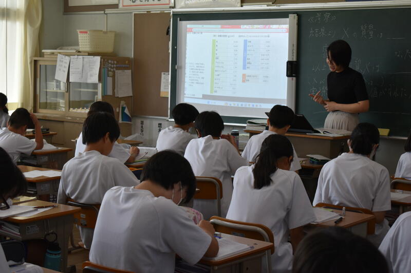 5校時に1年2組(社会)・1年3組(数学)・1年4組(理科)・2年1組(英語)・2年4組(国語)の学級で研究授業が行われました。いつもと違う雰囲気に、はじめは少し緊張気味で固い感じの皆さんでしたが、授業が進むにつれて、いつも通りに、和やかな雰囲気で前向きに取り組めていました。