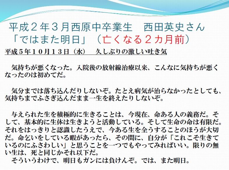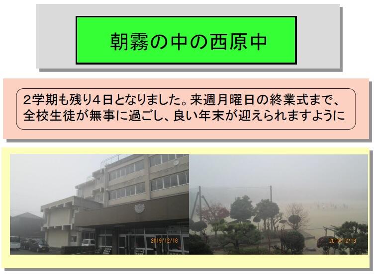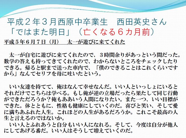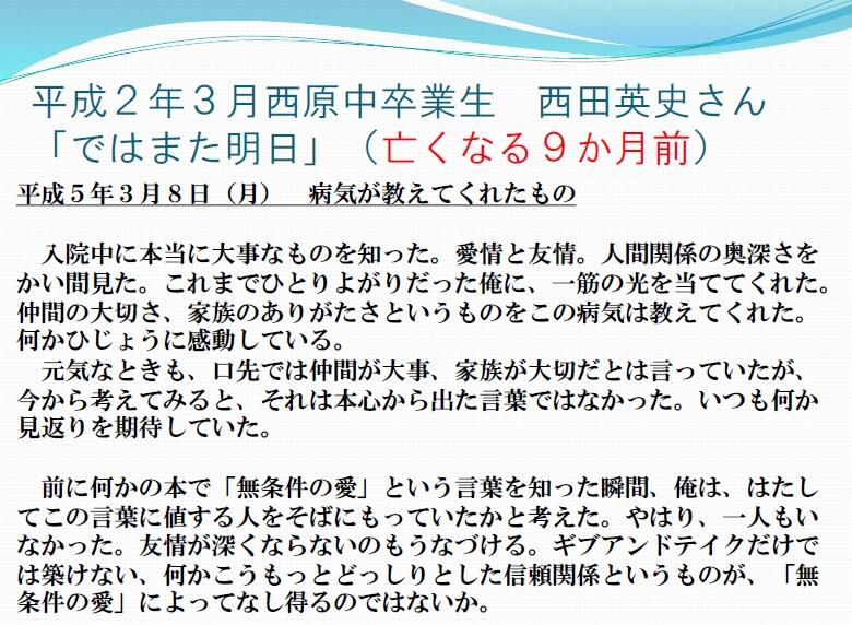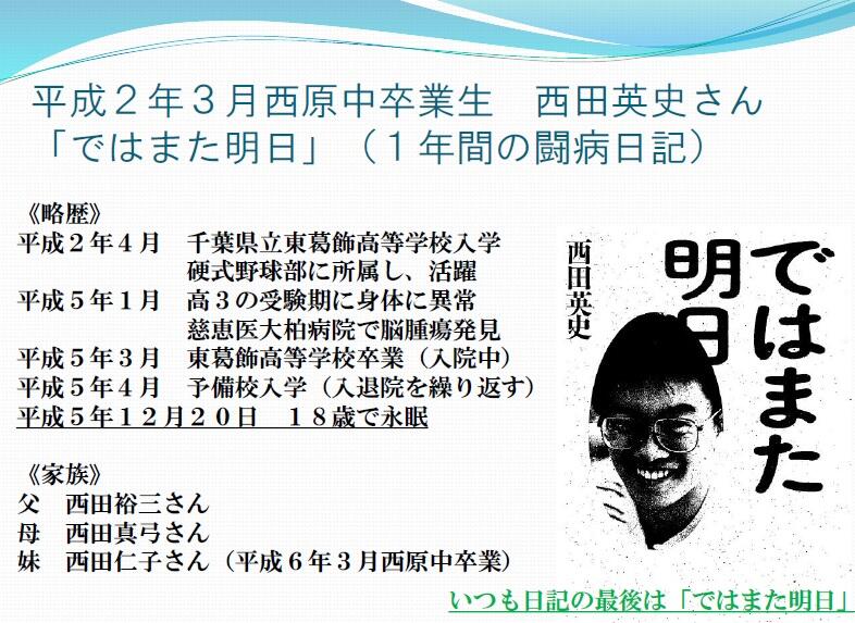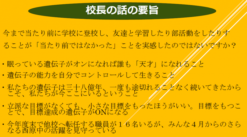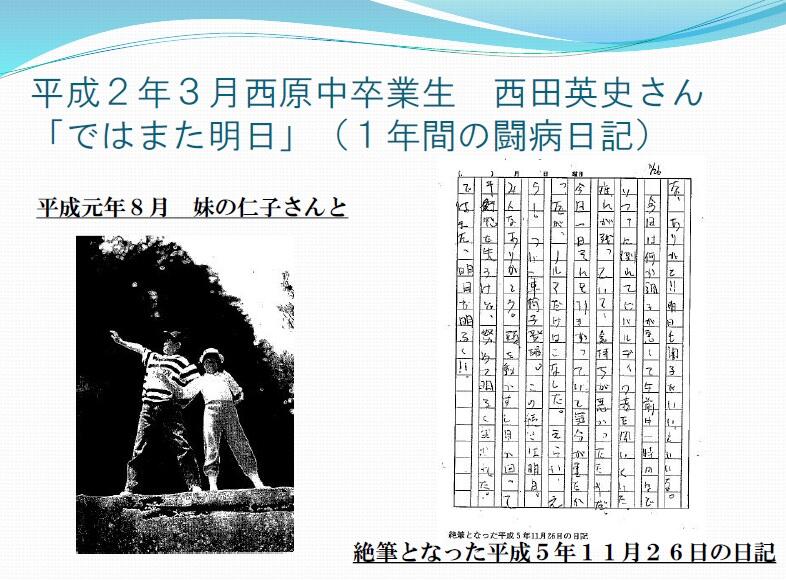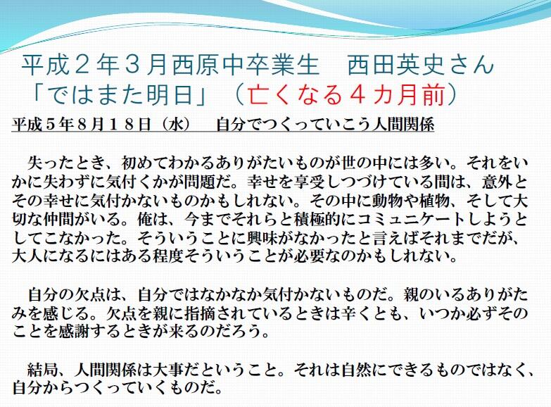 2学期の終業式は体育館に集まらず、画面で行いましたので、その日に紹介するはずだった西田先輩の日記を取り上げました。
