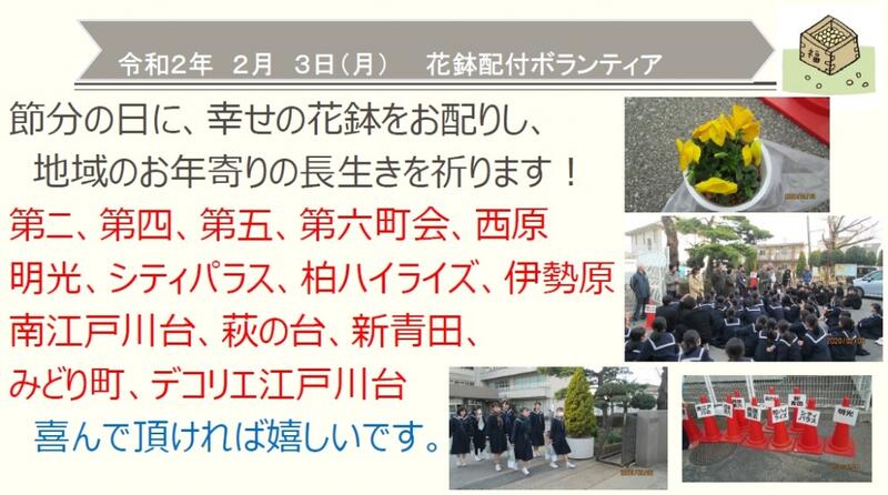 7月に続いて、地域のご老人の方々に、民生児童委員や地域の方々のお力をお借りして、冬の花鉢を自宅までお届けする活動を行いました。今回は2年生91名が参加しました。