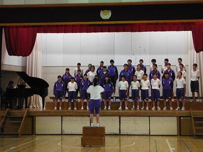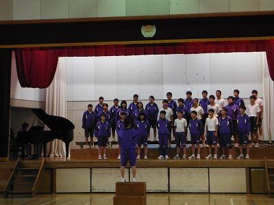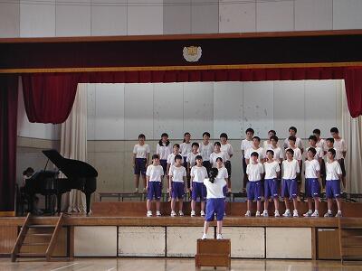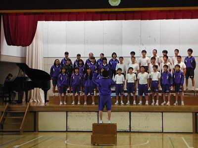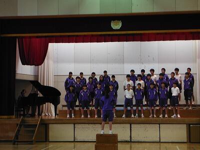 10月4日(水)の総合・帰りの会の時間に体育館で前半は1年5組が「怪獣のバラード」を,後半は2年2組が「3月9日」を練習していました。入退場や指揮に合わせての登壇等も含め,歌声委員や指揮者・伴奏者を中心に練習に取り組んでいました。今月より総合と帰りの会の時間に体育館,第一音楽室,第二音楽室を順番に各クラスに割り当てて練習を行います。西松祭の本番をお楽しみ下さい。