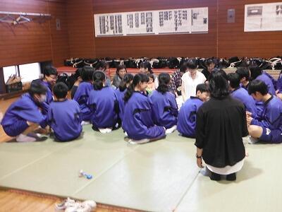 9月21日(金)合同帰りの会を体育館で開きました。全校生徒が集まって衣替えについて生徒指導主任を話を聞きました。衣替えの移行期間は9月25日(月)~10月6日(金)です。10月10日(火)より衣替え完全実施となりますので本日,配布した衣替え移行期間についてのお願いをご覧いただき,準備をお願い致します。明日は天気が心配ですが,水泳,テニス,ソフトボール,野球の市内新人戦が行われます。応援よろしくお願い致します。