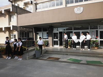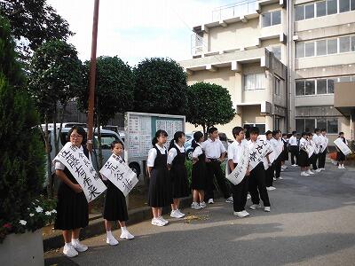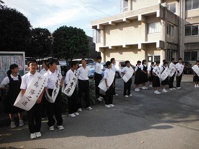9月22日(金)正門前から昇降口にかけて生徒会役員立候補者の選挙運動が行われていました。1,2年生の候補者はお手製にたすきをかけ,先輩の応援者を連れて登校する生徒に一生懸命呼びかけていました。選挙運動期間は27日(水)までです。28日(木)に立会演説会と投票が行われます。