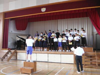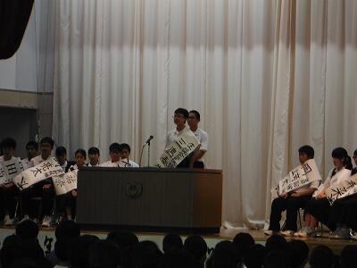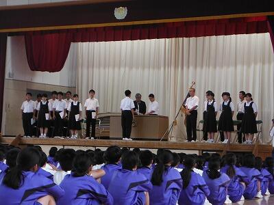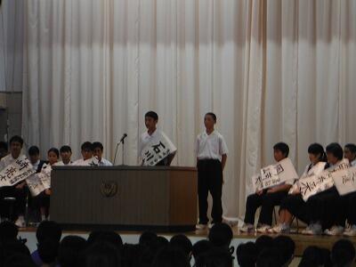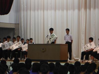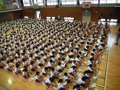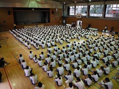 7月18日(火)の6校時に1年生は武道場,3年生は体育館で一学期のまとめ集会を開きました。どの学年も学級委員や部会長等の反省は述べられた後,一年生ではレク・学習・生活面で頑張ったクラスが表彰されていました。3年生では学年やクラスに貢献した生徒が表彰した後に修学旅行の映像を見ていました。