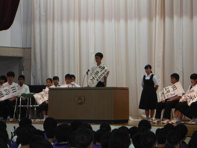 9月28日(木)5校時に体育館で生徒会選挙立候補者の立会演説が行われました。14名の候補者が応援演説者と共に全校生徒に向けて「よりよい西原中づくり」についてアピールしました。その後,公約についての質疑応答が行われ,最後に学年ごとの投票所で本物の記載台と投票箱を使用して投票を行いました。選挙管理委員会の皆様のご協力に感謝申し上げます。明日の朝,結果が掲示される予定です。