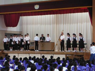 7月20日(木)梅雨も明け,終業式となりました。最初に表彰集会を行い,ポスター,健歯コンクール,善行賞,バレーの文化・個人部門を表彰した後,運動部の卓球,ソフト,陸上,水泳の各部の表彰を行いました。終業式では各学年の代表と生徒会長より学期の振り返りや夏休みに向けての話をしてもらった後,校長,生徒指導主任,、安全主任,教頭より一学期及び夏休みの生活について指導しました。安全で楽しく健康的な夏休みを送ってほしいと願います。また,家族や地域の一員としての役割も果たしてほしいと願います。保護者の皆様,地域の皆様,本校の一学期の教育活動にご理解とご協力をいただきありがとうございました。明日から夏季休業となりますが,大会・コンクール・発表会等が始まります。応援よろしくお願い致します。