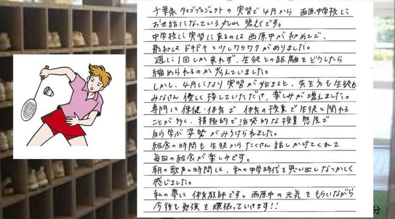 教育実習は3~4週間ですが、このたまごプロジェクトは1年間ですので、1年間の学校の流れが体験できることがメリットです。本日、1学期 回の研修が終わりましたので、本人の紹介と感想をアップします。丸山先生は、中学時代にバドミントンの選手だったそうです。