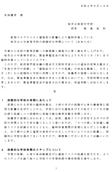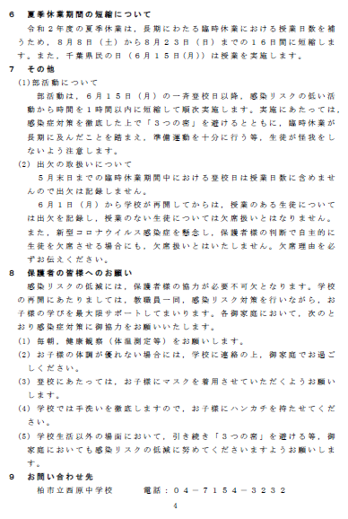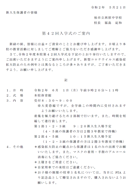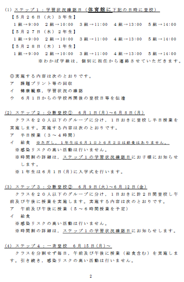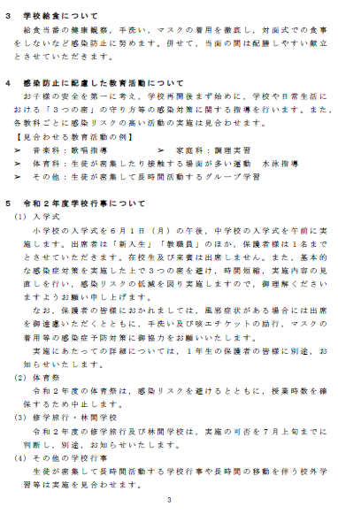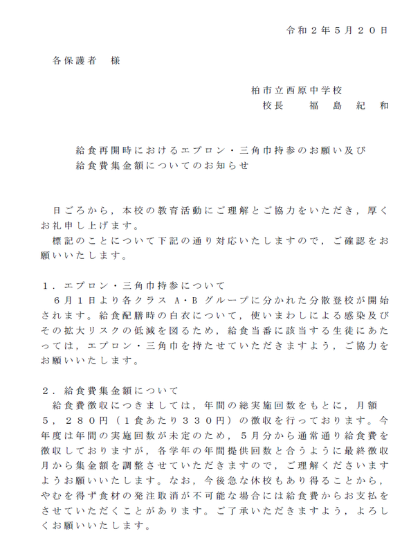 給食再開時エプロン・三角巾持参のお願い及び給食費集金額について他