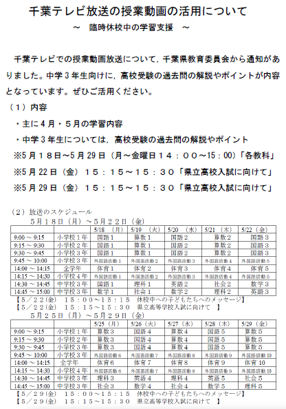 休校中学習支援【中学3年生向け】 「千葉テレビ授業動画」について