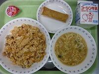 キムチチャーハン 春巻き トック入り卵スープ ひとくちりんごゼリー 牛乳