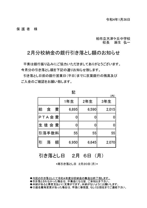 【今年度最終引落】令和5年2月分の校納金の銀行引き落とし額のお知らせ